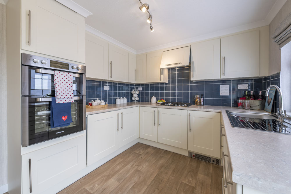 The light and airy family bathroom lives up to the ‘luxury accommodation’ feel with stylish fittings and crisp detailing. The generously proportioned kitchen is a separate room, with a range of cream ‘shaker-style’ wall and floor cabinets, fully tiled splash-back and all plumbed-in appliances. It even has a proper back door!